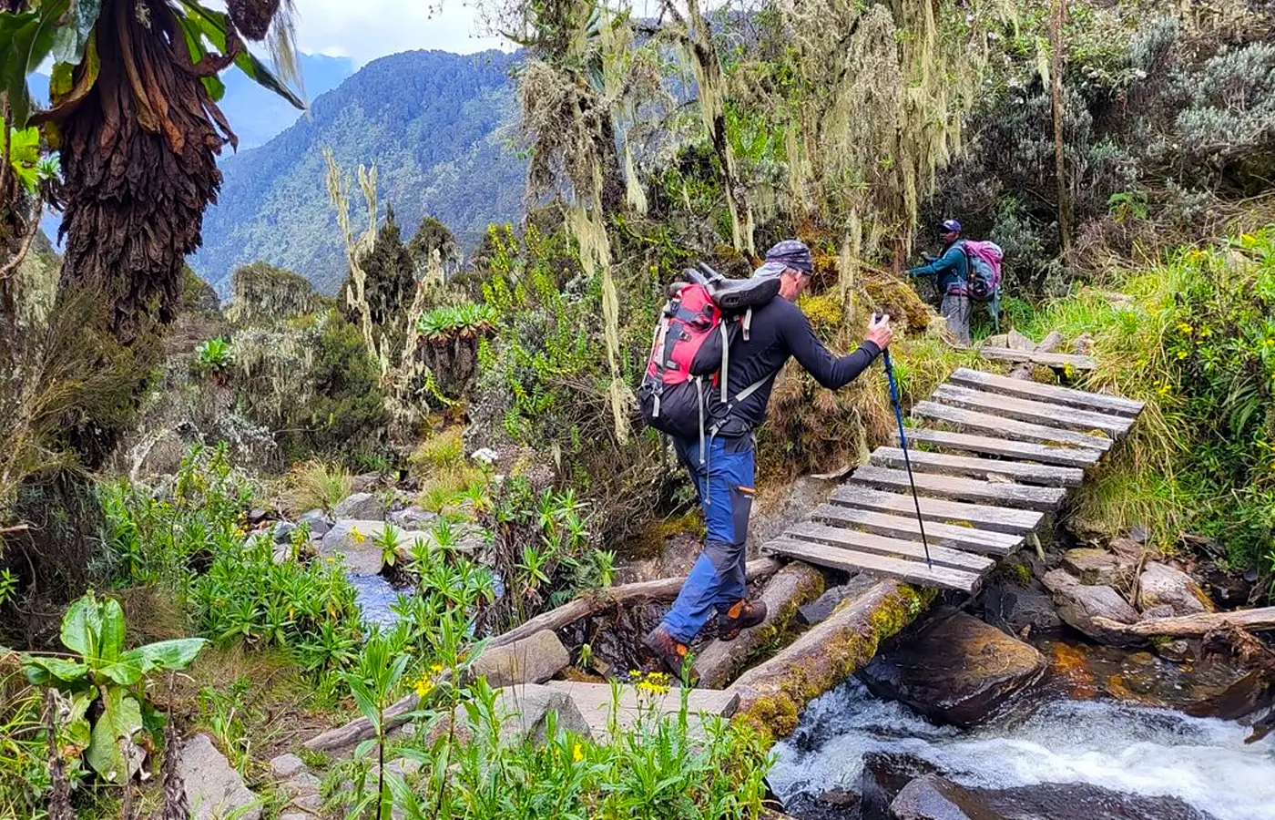 Your Rwenzori Trek begins at Mihunga Gate, where you’ll meet your hiking team for a safety briefing and guide introductions. From there, the trail ascends gently into the montane rainforest, filled with towering trees, cascading vines, and the sounds of the Mubuku River below.