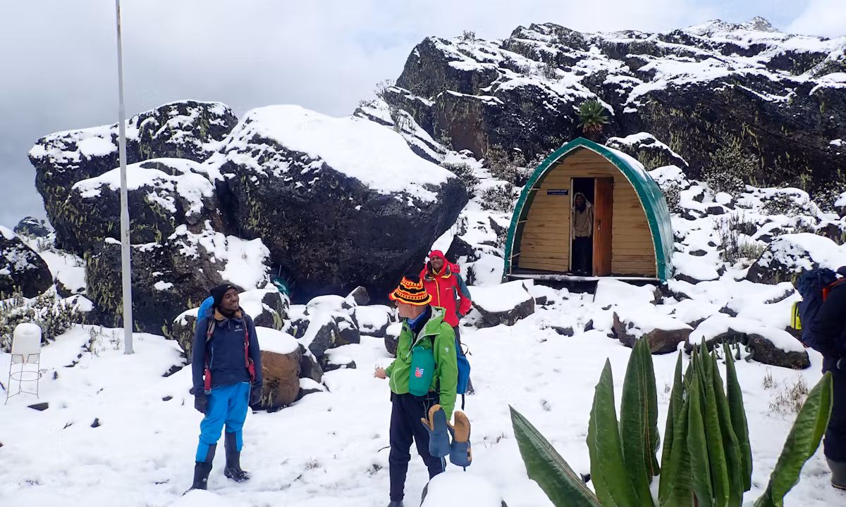 Climb to Bamwanjara Pass (4,450 m) for sweeping views of Stanley, Speke, and Baker. Continue to Hunwick’s Camp near McConnell’s Prong.